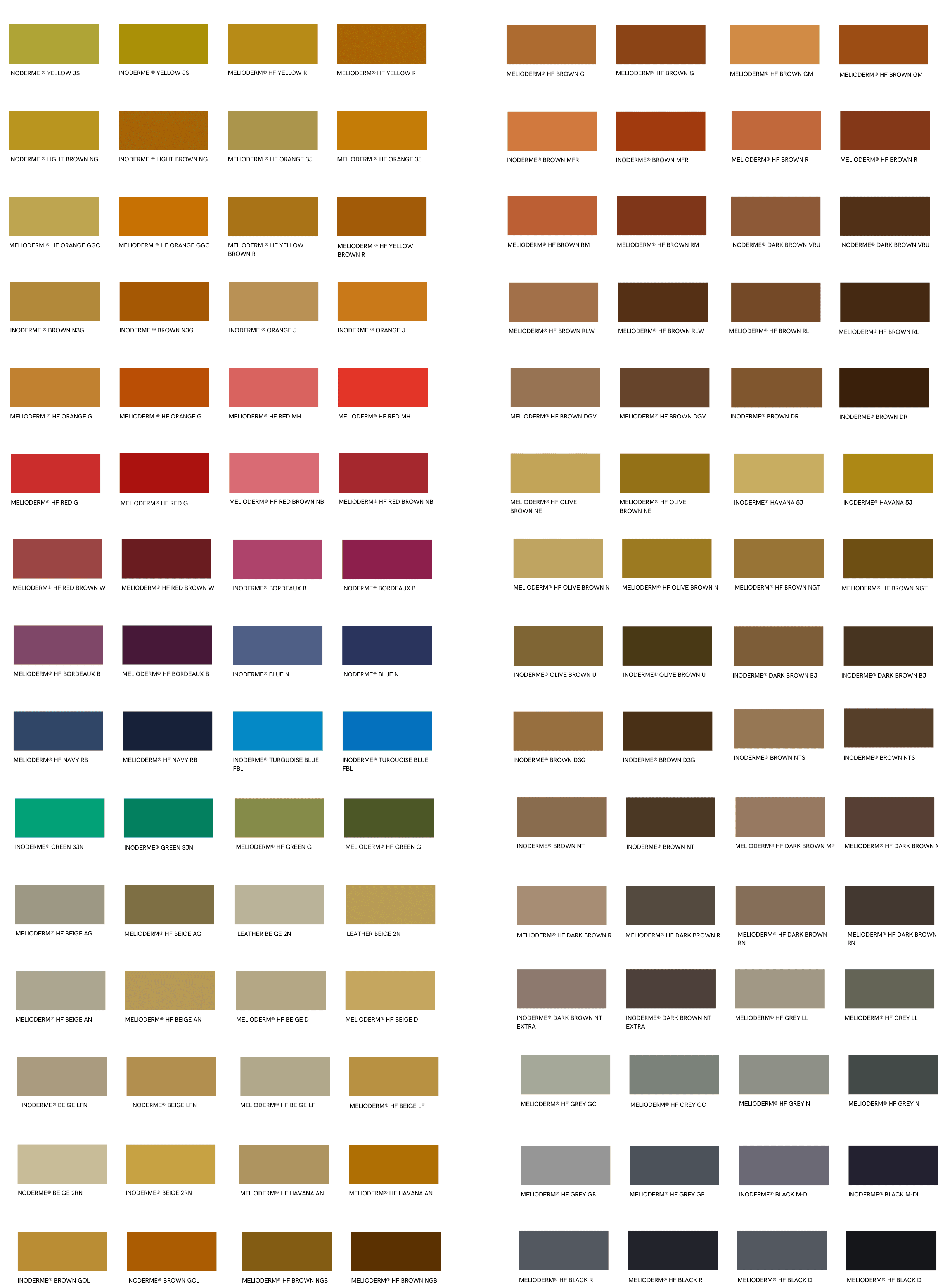 Thanks to its metal-complex nature, Melioderm HF and Inoderme dyes show a high level of balanced fastness properties. Featuring a broad color palette, the Melioderm® HF line stands out for its outstanding fastness properties, excellent combinability and superior coverage and penetration.